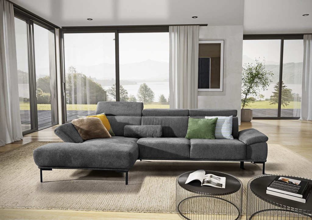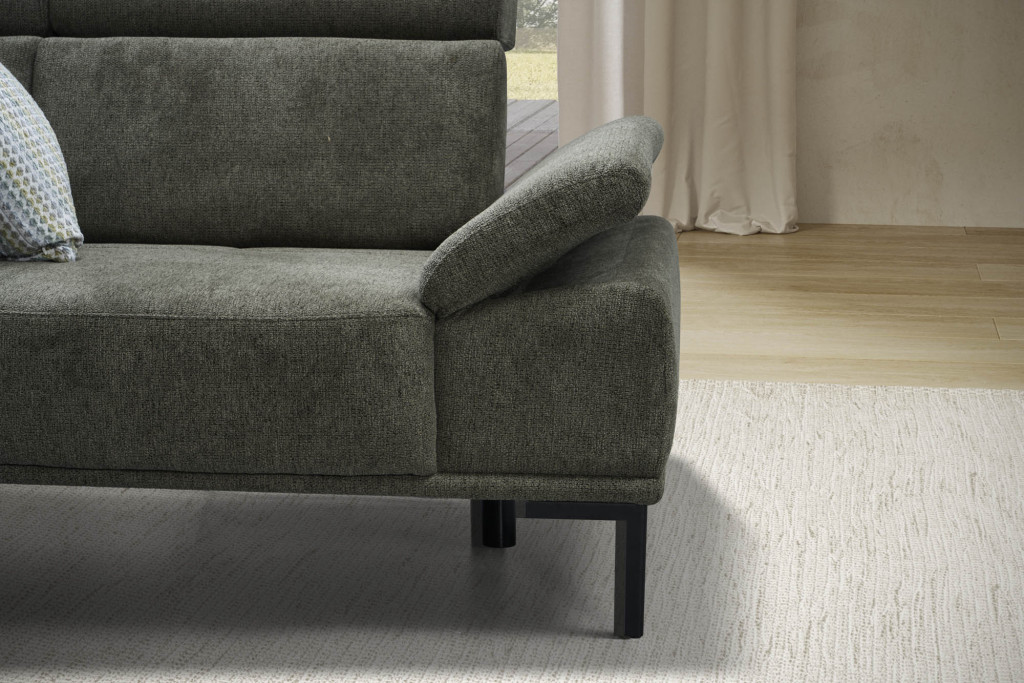Stoff Mito Fb.156 hunter, Sitzqualität Soft, Sitzfläche S1 glatt, Rücken echt, Fuß 4.26-18 cm Farbe schwarz, Sitzhöhe ca. 44 cm, bestehend aus: 70100 - Longchair inklusive in der Sitzfläche integriertes klappbares Armteil, ca.115x185 cm 02111 - Element 2sitzig, Armteil fest, inklusive 2x Sitztiefenverstellung, ca.185 cm Stellmaß ca. 185x300 cm