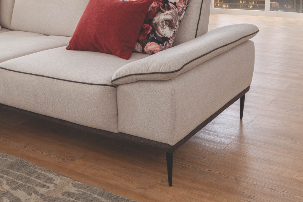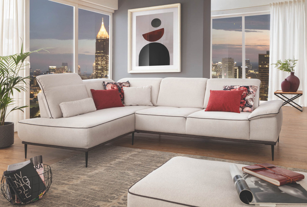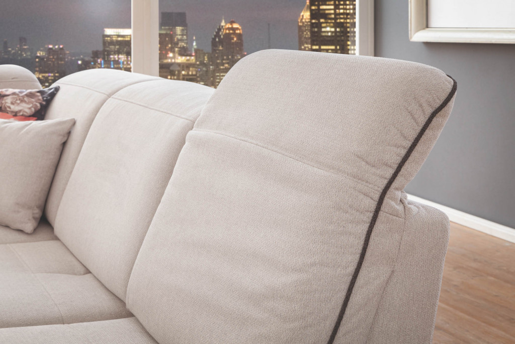 Stoff Comora, Farbe kiesel, mit Keder und Sockel, Rücken echt, Sitzqualität Soft, Metallfuß 4.26 silber glänzend, Sitzhöhe 47 cm, Sitztiefe 56-75 cm, bestehend aus: 02110 - Sofa 2-sitzig, 1 Armteil links, 2x Sitztiefenverstellung inklusive, ohne Kopfteilverstellung, BHT ca. 185/81/115 cm 70208 - Ottomane groß, 1x Sitztiefenverstellung inklusive, ohne Kopfteilverstellung, BHT ca. 115/81/215 cm Stellmaß ca. 280x215 cm