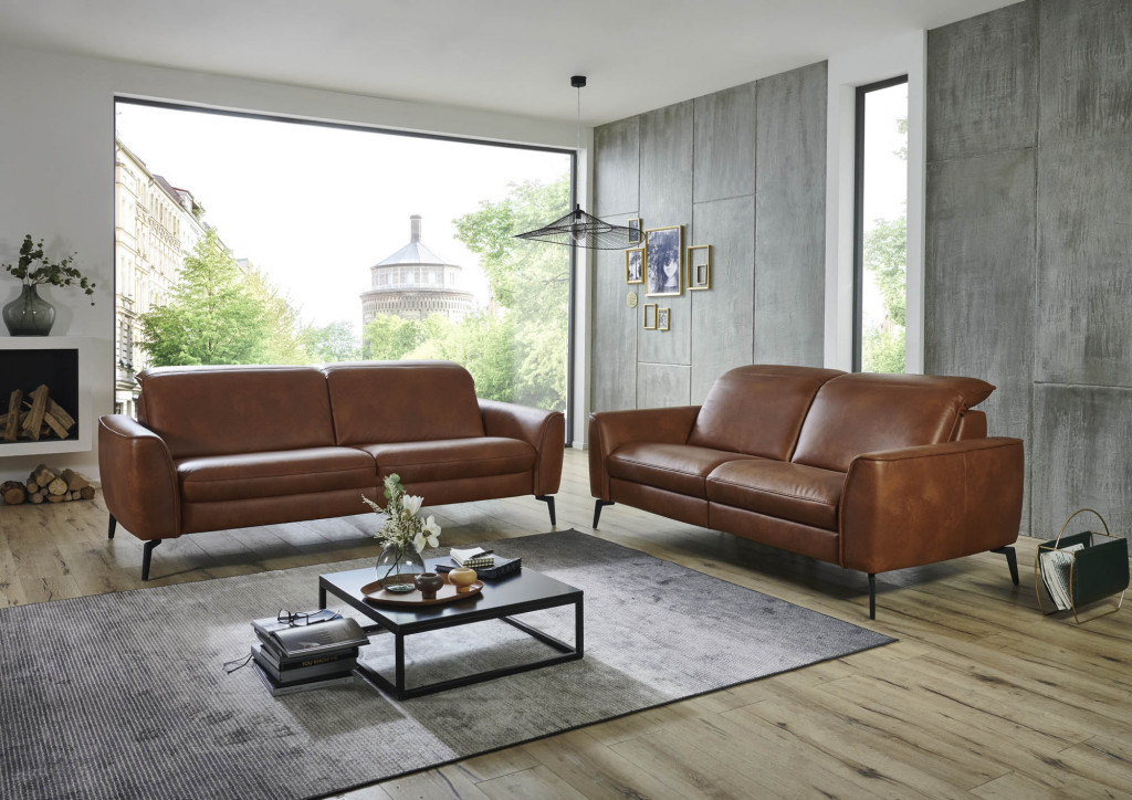 pigmentiertes Leder, Farbe cognac, Rücken Nessel, Sitz weich, Fuß schwarz, Sitzhöhe 48 cm, Sitztiefe 55 cm, bestehend aus: