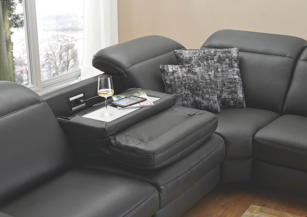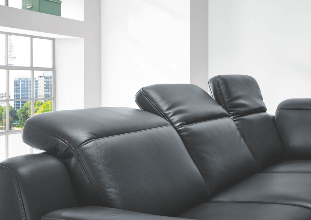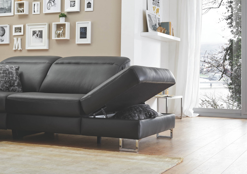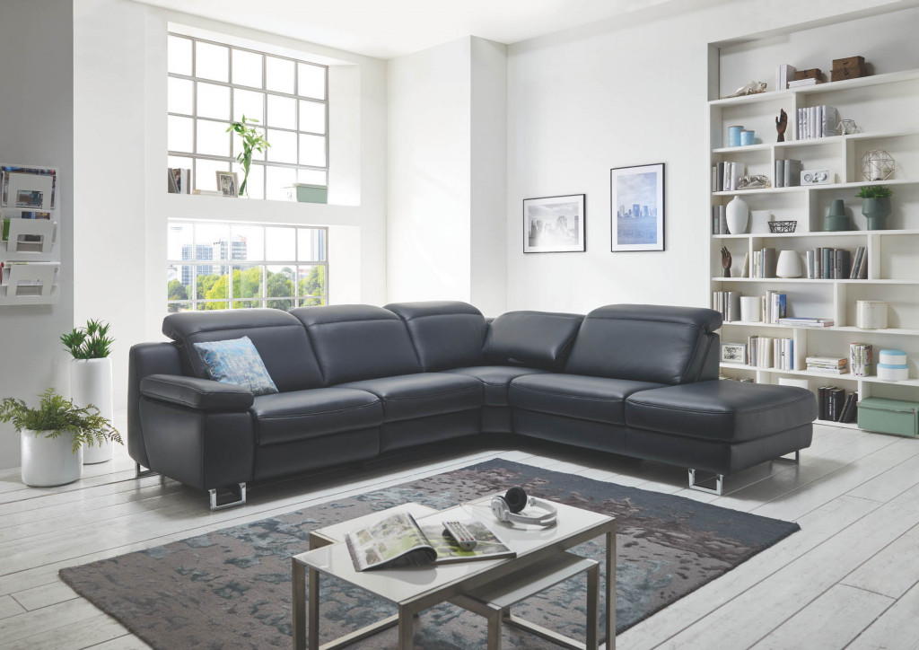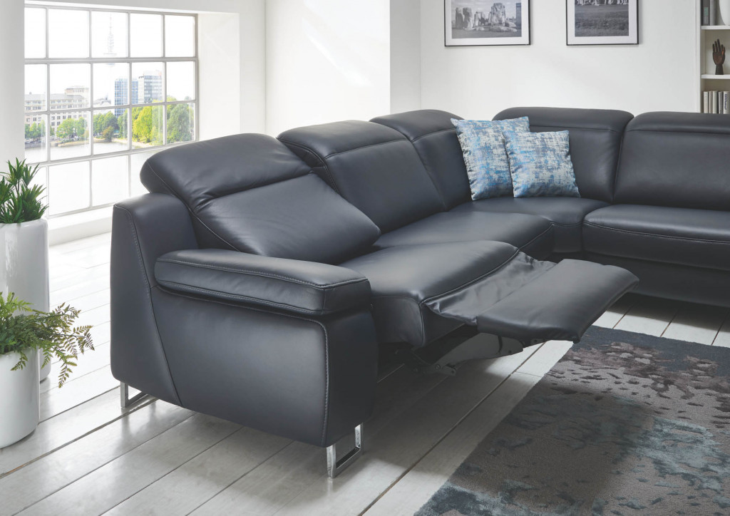 Leder Credo, Farbe schwarz, Rücken unecht, Sitz F2 mittel, Metallfuß Chrom 11 cm, Sitzhöhe 46 cm, Sitztiefe 54 cm, bestehend aus: 2,5LKV - 2,5-Sitzer, Armteil links, inklusive Kopfpolsterverstellung, BHT ca. 179/85-103/105 cm REKV - Rundecke, inklusive Kopfpolsterverstellung, BHT ca. 117/85-103/117 cm 1,5KVAhoR - 1,5-Sitzer mit Anstellhocker rechts, inklusive Kopfpolsterverstellung, BHT ca. 144/85-103/105 cm Stellmaß ca. 296 x 261 cm