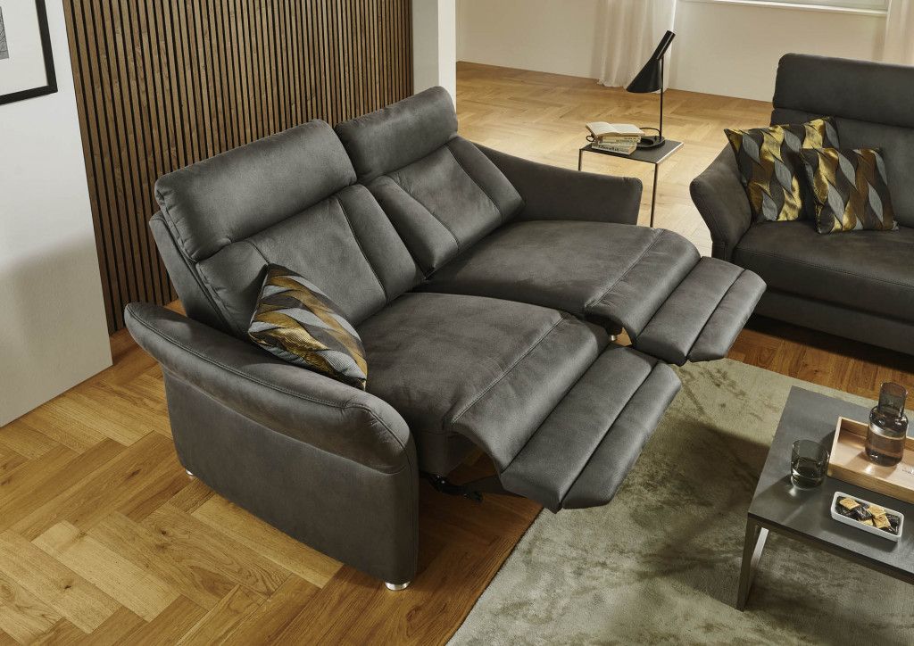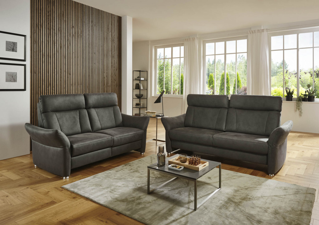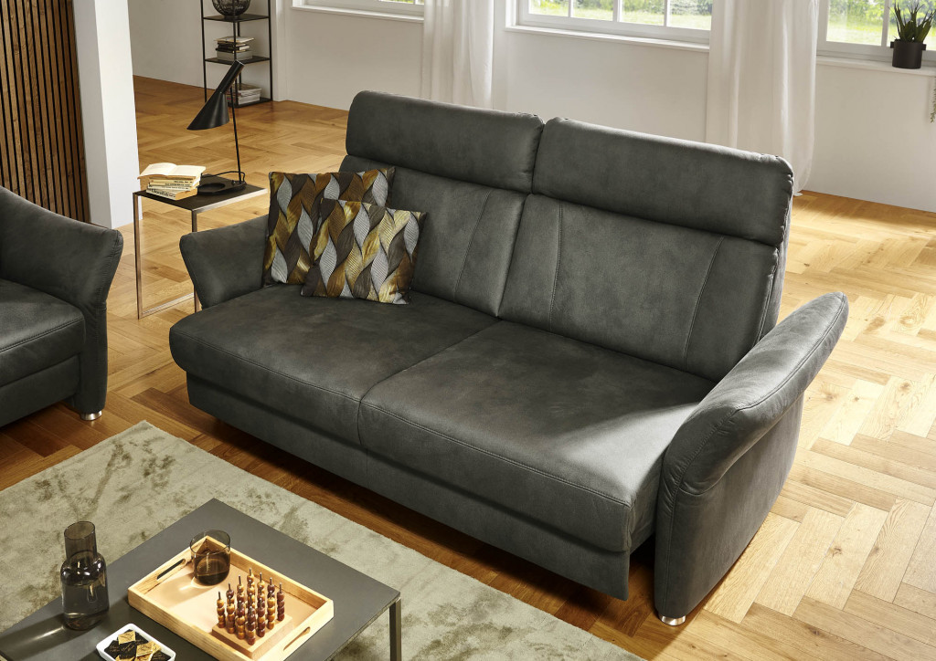 Stoff Deluxe, Farbe anthrazit, Rücken echt, Sitz Kaltschaum, Metallfuß chrom, Sitzhöhe 49 cm, Sitztiefe 52 cm, 2,5-Sitzer, 2 Armlehnen, Kopfteilverstellung, BHT ca. 204/104/91 cm
