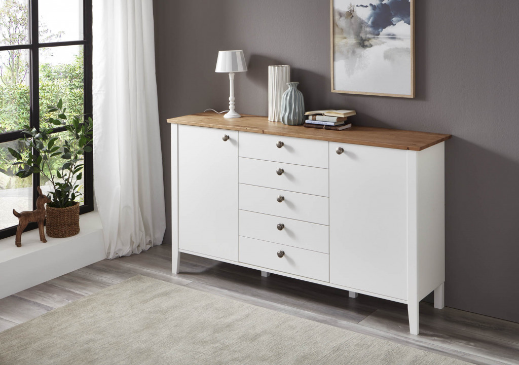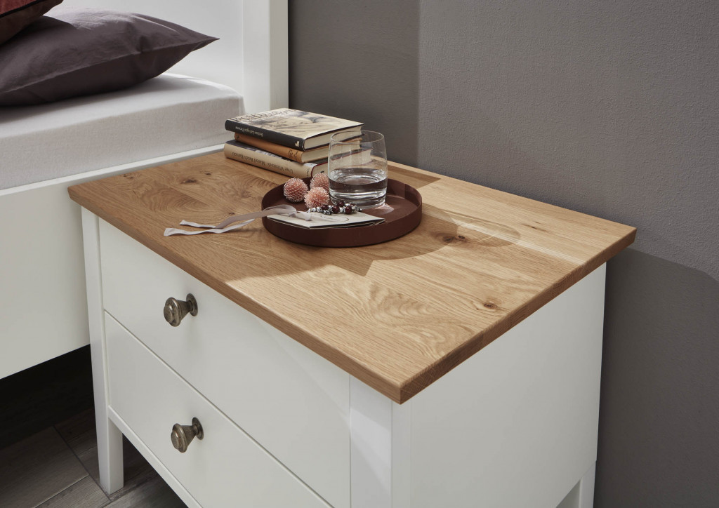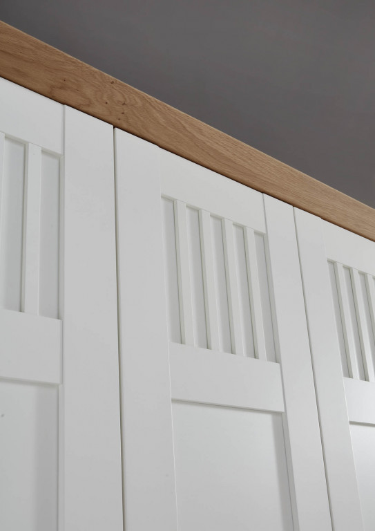 Korpus Lack weiss Echtholz furniert, Front Lack weiss Massivholz, Akzentteile Wildeiche Echtholz furniert, Landhausgriff, bestehend aus: