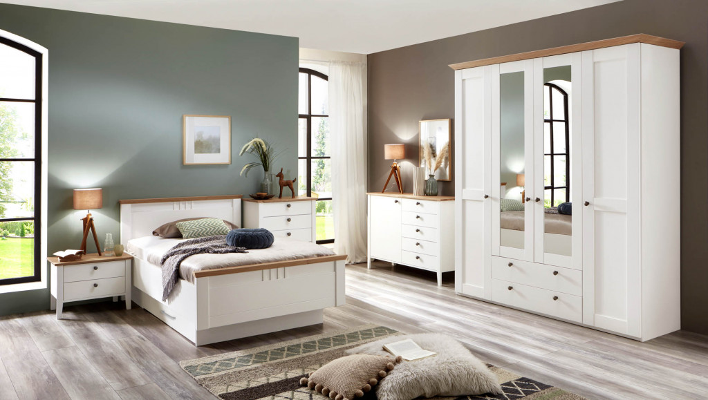 Verleihen Sie Ihrem Schlafzimmer zeitlose Eleganz mit diesem stilvollen Landhaus-Schlafzimmer-Set. Der Korpus ist weiß lackiert und hochwertig echtholzfurniert, die Fronten bestehen aus massivem, weiß lackiertem Holz. Akzentteile in Wildeiche-Echtholzfurnier setzen natürliche Highlights. Das Set umfasst einen 6-türigen Drehtürenschrank mit Sprossentüren und Türdämpfung sowie ein Doppelbett mit Stollenkopfteil, hohem Fußteil und Handlauf in Wildeiche. Zwei Konsolen mit jeweils zwei Schubkästen und Abdeckplatten in Wildeiche bieten zusätzlichen Stauraum. Ein großer Typenplan ermöglicht individuelle Zusammenstellungen. Die eleganten Landhausgriffe runden das harmonische Gesamtbild ab – für ein behagliches Wohnambiente im klassischen Landhausstil.