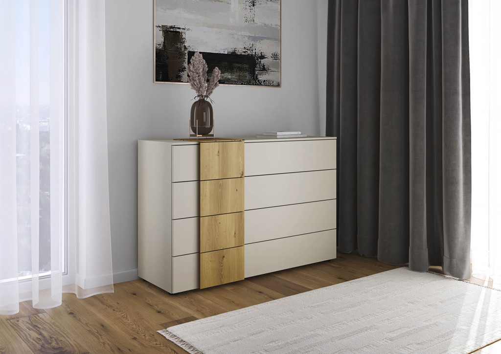 Front und Korpus champagner Dekor, Farbglas champagnerfarben, Absetzung Asteiche massiv, Hirnholz massiv, Griffe/Füße champagner, bestehend aus: