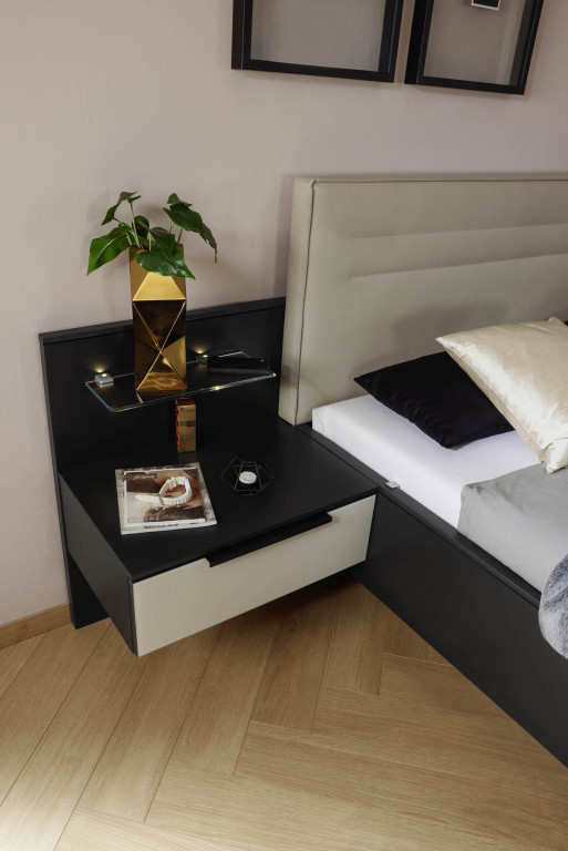 Nachttisch 614G - Korpus Alpinweiß, Front Glas seidengrau glänzend (PG2), Griffleisten chromfarben, BHT ca. 50/48/42 cm