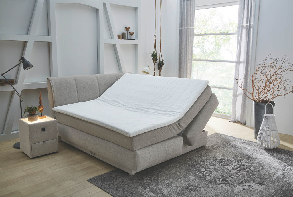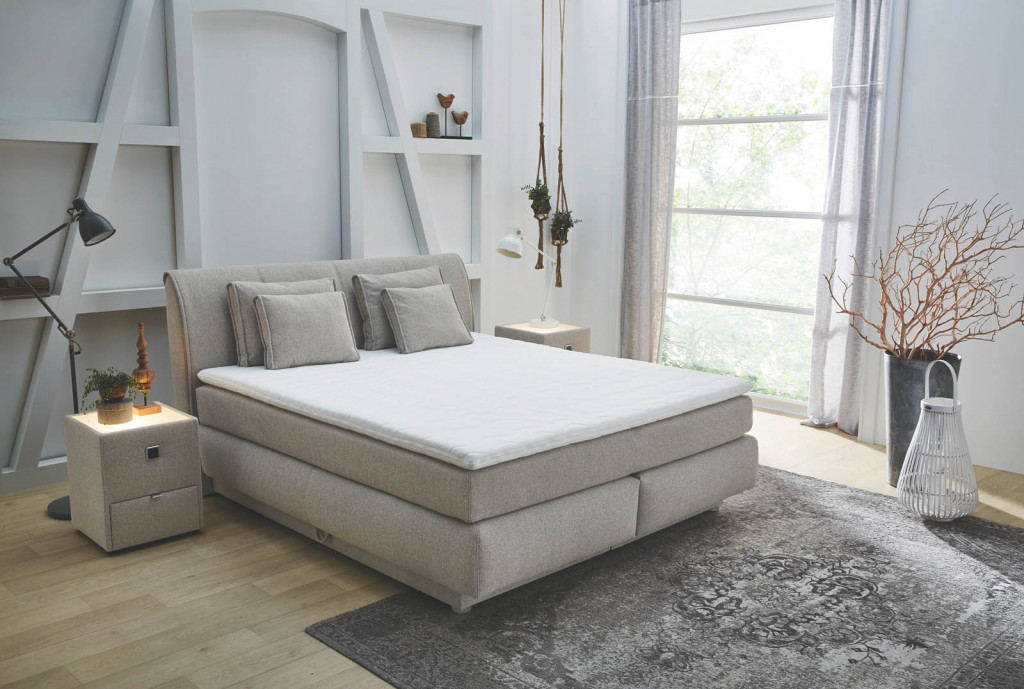 Liegefläche 180x200cm, Grundlage Box mit einer Bonell-Federkernpolsterung, darauf liegt eine 7-Zonen Tonnen-Taschenfederkern-Matratze im Tandembezug, 2x weich, Abschluss ist ein Kaltschaumtopper, Dessin Gestell/Kissen 414/07, inklusive 2 große und 2 kleine Kissen, Topperbezug 60° waschbar, Füße chromfarbig, integrierte Bettkästen mit Gasdruckfedern beidseitig zu öffnen, BHT: 189x112x223 cm, LH 65cm