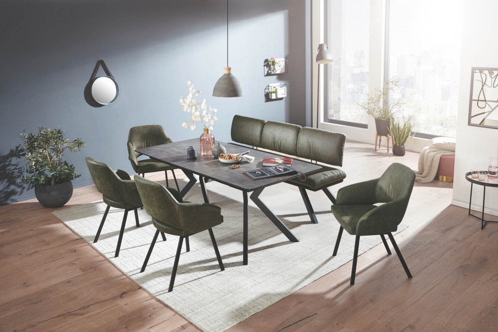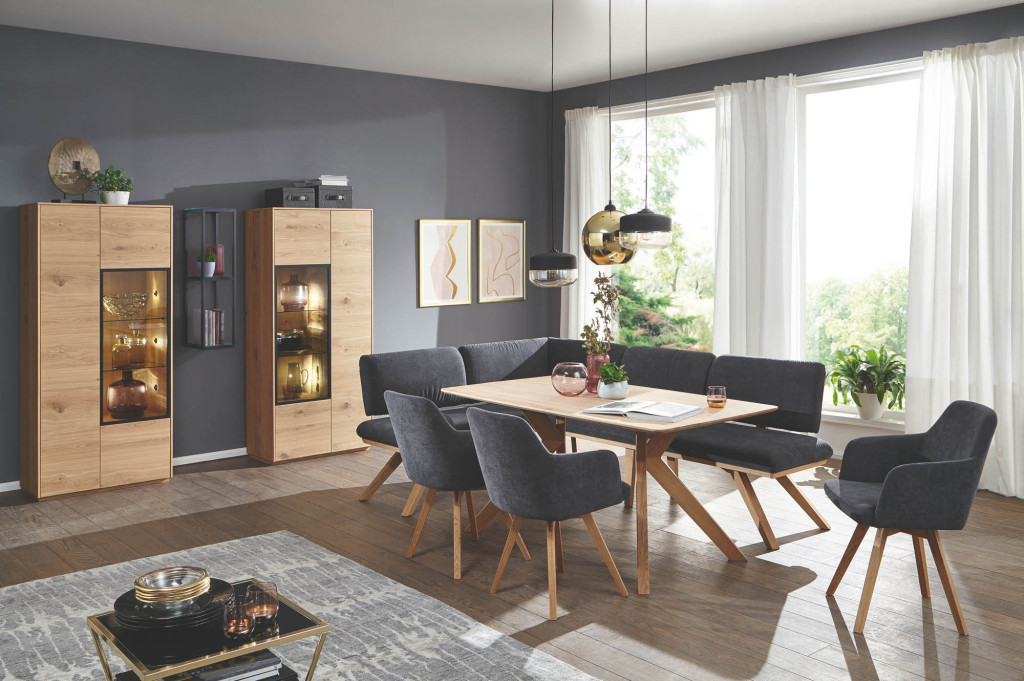 5-tlg. in Wildeiche Samtöl bestehend aus: Eckbank, Sitz gepolstert, Lehne Variante 2 (kurz), Bezug: Sitz Amour 5513 mint, Lehne Forza 5510 mint Außenseite: CAT11 (Holzfüße schräg), li. 165 x re. 235 cm Tisch Mod. Lucia 300, 160 x 90 cm, Platte Asteiche massiv, Gestell LV2 (Holzfüße schräg), Variante M2 soft mit Optikkante Holz, inklusive Auszugsfunktion (50cm) mit Einhanddrehfunktion in Asteiche (MP) Stuhl Mod. Lucia 101, Sitz / Lehne gepolstert, Bezug: Sitz Amour 5513 mint, Lehne Forza 5510 mint Stuhl Mod. Lucia 101, Sitz / Lehne gepolstert, Bezug: Sitz Amour 5513 mint, Lehne Forza 5510 mint, inklusive 1x Drehfunktion (MP) Stuhl Mod. Lucia 201 , Sitz / Lehne gepolstert, Bezug: Sitz / Lehne Forza 5510 mint