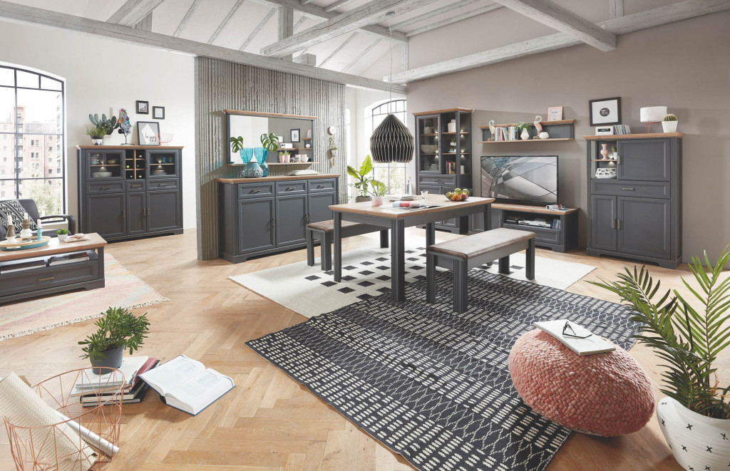 Wahlweise mit Front und Korpus graphit mit Absetzungen Artisan Eiche Nachbildung