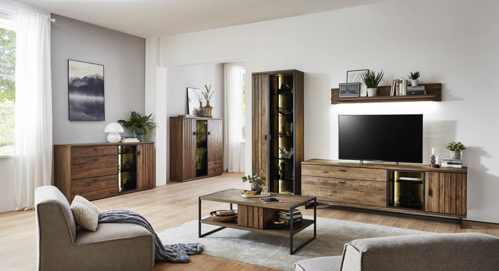 Front Eiche Cognac Lamelle massiv, Korpus außen Eiche Cognac furniert, Rahmen schwarz matt pulverbeschichtet, Glas Schwarzglas, Schubkästen mit Selbsteinzug und Dämpfung, Kombi bestehend aus: