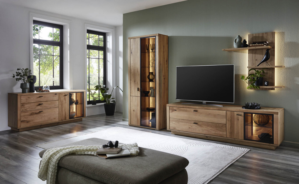 Front Eiche Lamelle massiv geölt, Alurahmen schwarzgrau, Korpus Eiche Artisan Melamin, sichtbare Rückwände Folie sandgestrahlt, Glas Parsolglas, Schubkästen mit Dämpfung, Kombi bestehend aus: