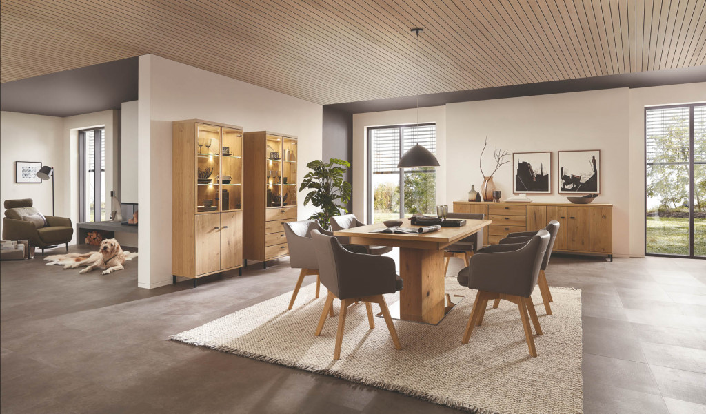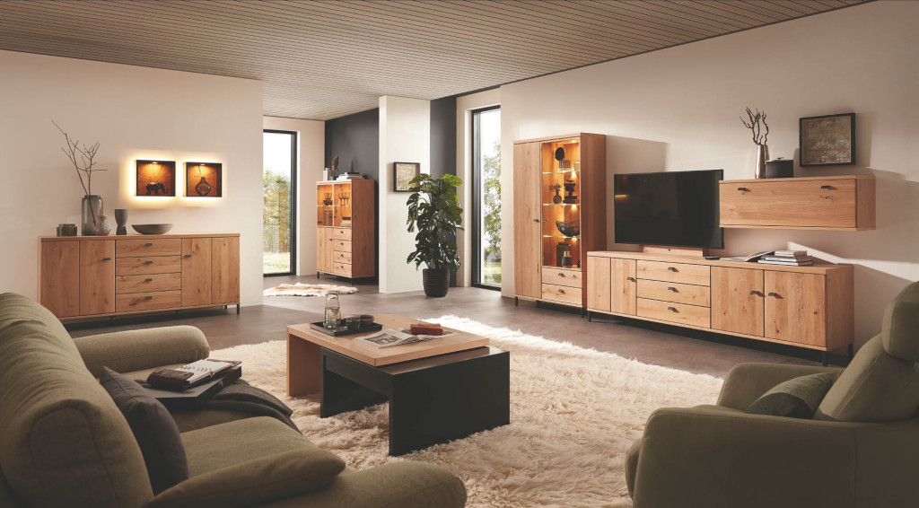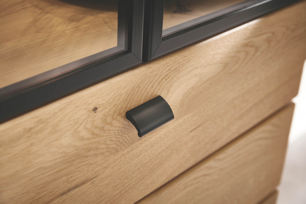Front Asteiche massiv, Korpus Asteiche furniert, Glasfront klarglas mit schwarzem Alurahmen, Griff schwarz matt, Füße schwarz matt, bestehend aus: