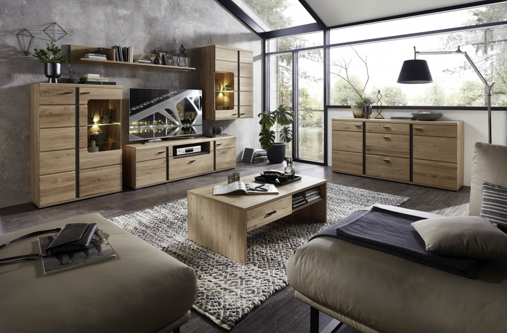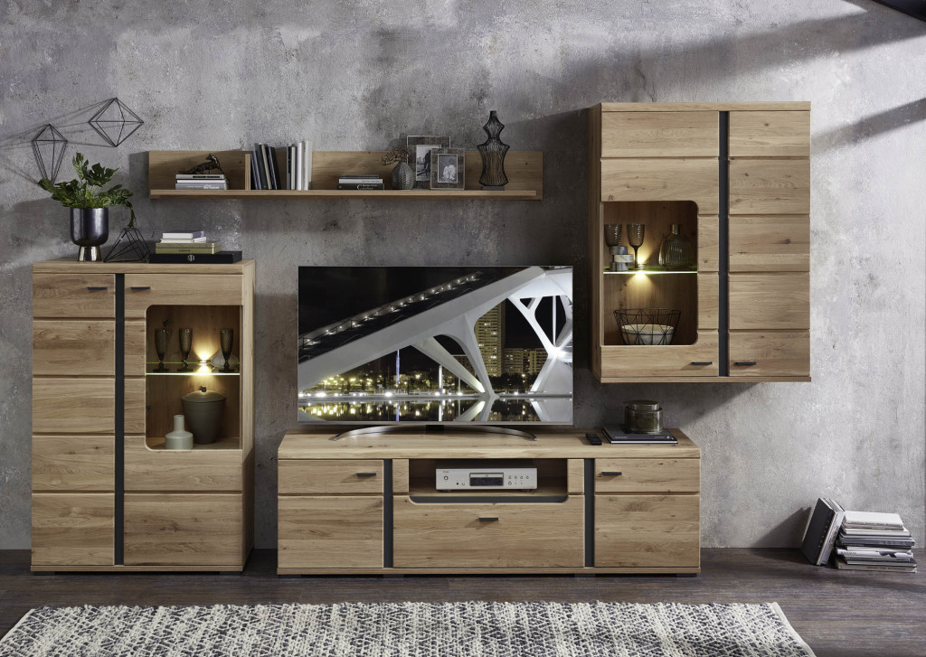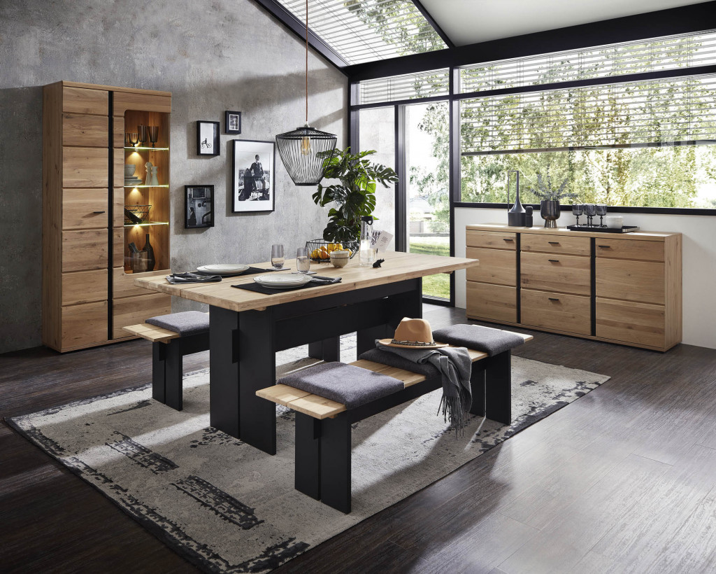 Front Altesche massiv gebürstet, durchgehende Lamelle, Korpus Old Artisan Oak Nachbildung, Absetzung schwarz matt, bestehend aus Typen 01/04/31/40,mit Softclose und Selbsteinzug, inkl. LED Beleuchtung, Griff Metall schwarz matt, BHT ca. 360x203x42cm