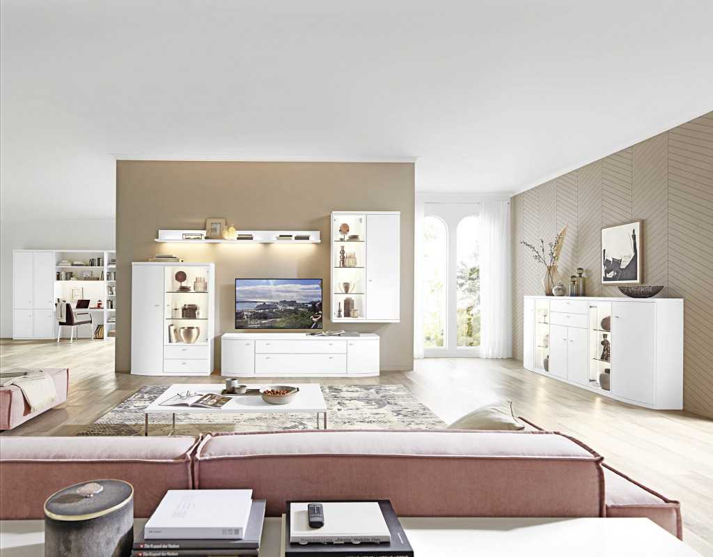 Verleihen Sie Ihrem Wohnzimmer Charakter mit der Wohnwand großer Typenplan. Diese elegante Wohnwand ermöglicht es Ihnen, aus einer Vielzahl von Fronten, Korpussen und Griffen zu wählen, sodass Sie Ihren individuellen Stil perfekt umsetzen können. Ob stilvolle Hochglanzfronten, warme Holzoptiken oder edle Metallgriffe – jede Kombination bringt eine besondere Note in Ihr Zuhause. Optional erhältlich ist eine integrierte Beleuchtung, die für ein harmonisches Ambiente sorgt und Ihre Dekorationen gekonnt in Szene setzt. Diese Wohnwand vereint Funktionalität und ästhetische Vielfalt und wird zum Herzstück Ihres Wohnbereichs. Machen Sie Ihr Zuhause zu einem Ort der Gemütlichkeit und des Stils!