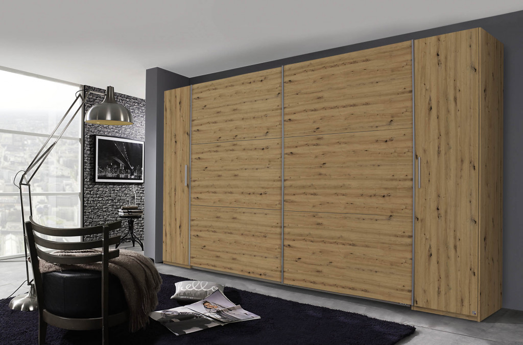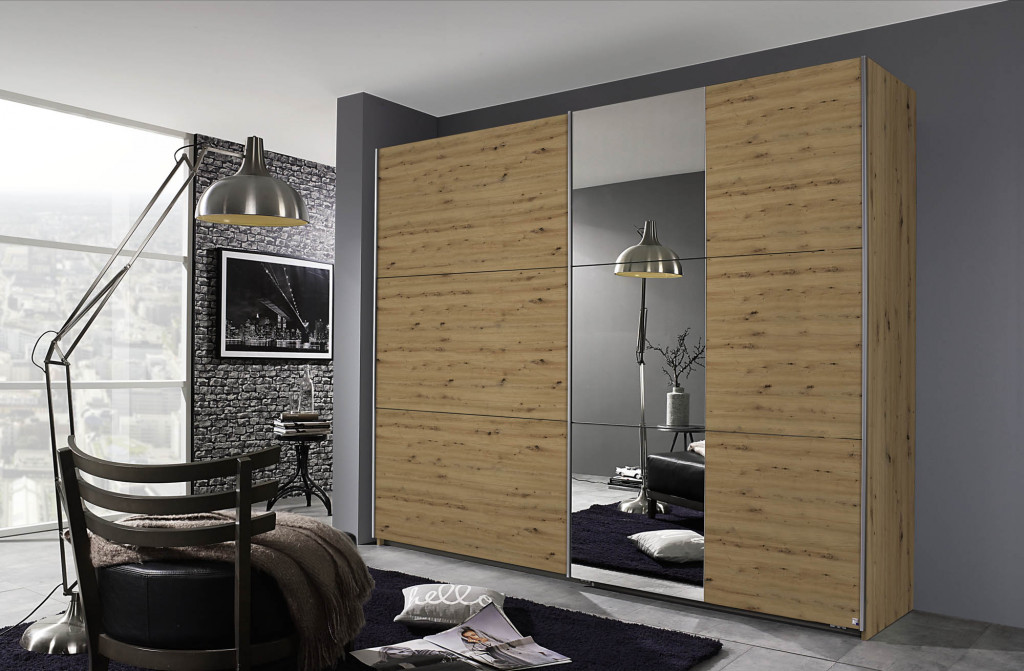 AD654.081I, Front/Korpus Dekor-Druck Eiche Artisan, Innen Texline, Griffleisten alufarbig, 4-türig, 2 Spiegeltüren, Teilspiegelfront, BHT ca. 268/210/60 cm, Raster Innen ca. 45/45/87/88 cm