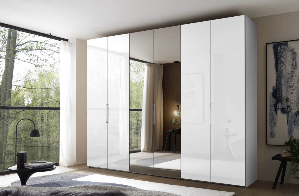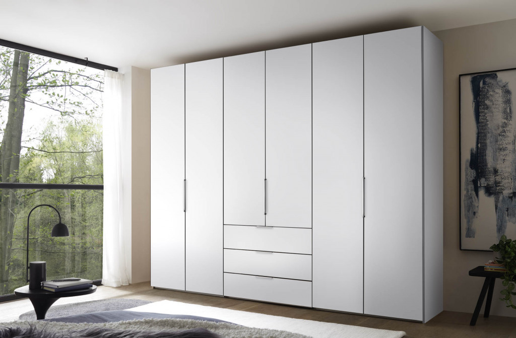Der elegante Drehtürenschrank überzeugt durch seine hochwertige Verarbeitung und zeitloses Design. Der Korpus im Dekor Sand harmoniert perfekt mit den Fronten aus edlem Sandglas. Die mittig platzierten schwarzen Zierleisten und Griffe setzen stilvolle Akzente und unterstreichen die moderne Optik. Mit sechs Türen bietet der Schrank großzügigen Stauraum und eine durchdachte Innenaufteilung. Maße: B/H/T ca. 298/222/63 cm. Weitere Größen und Ausführungen sind erhältlich, sodass sich der Schrank individuell an Ihre Wohnsituation anpassen lässt. Ein Möbelstück, das Ästhetik und Funktionalität auf höchstem Niveau vereint.