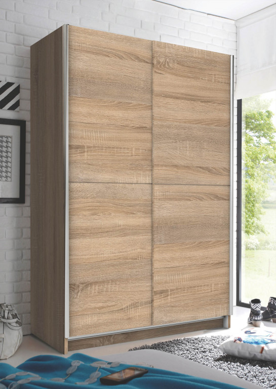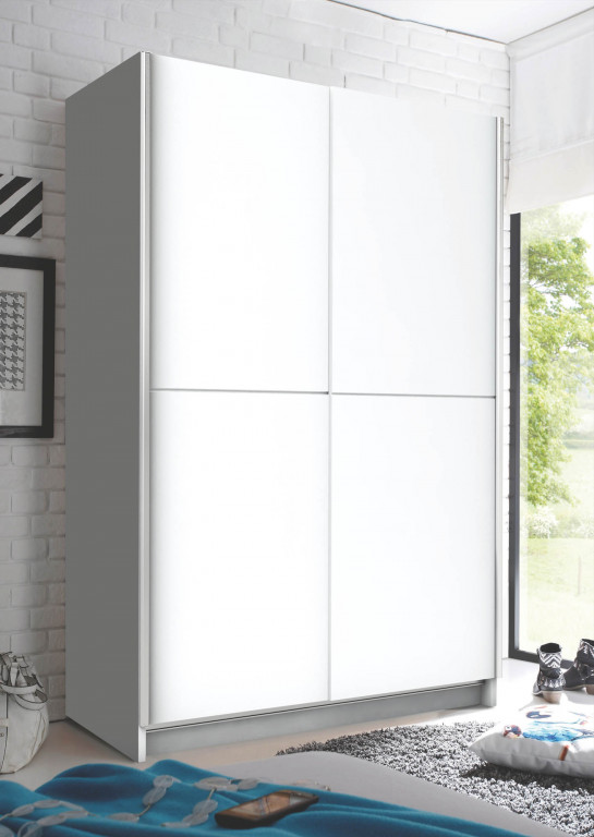 Schwebetürenschrank 2-trg. mit Spiegel in -17 Weiß , BHT 125x195,5x38cm, Inneneinteilung: 1 Mittelseite/links 5 Böden, rechts 1 Boden/1 Garderobenauszug (Teleskopkleiderstange)