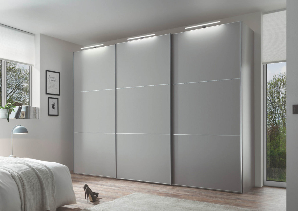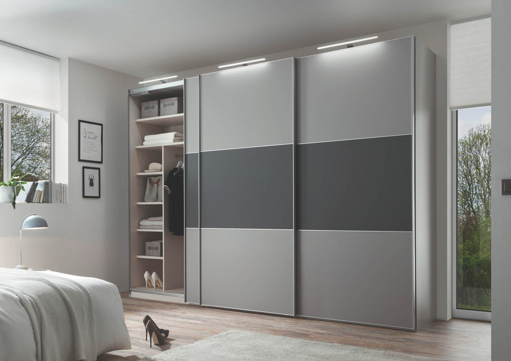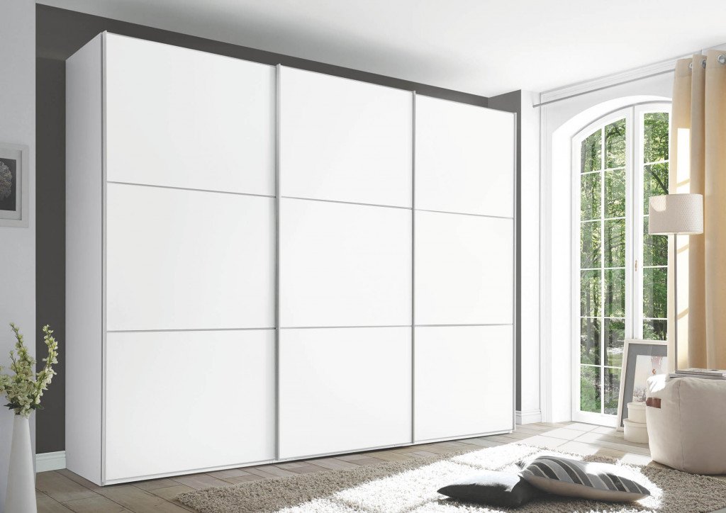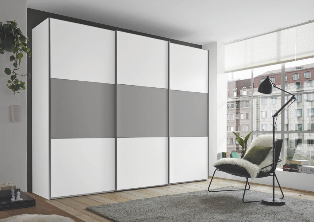 Korpus Dekor weiß, Front Hochglanz weiß, Spiegel mittig, Frontausführung 3, Griff- und Zierleisten schwarz, mittig Ausstattung Premium - Türen gedämpft, T-Einteilung, 2er Schubkasten gedämpft - Schwebetürenschrank, 3-türig, BHT ca. 280/222/63 cm