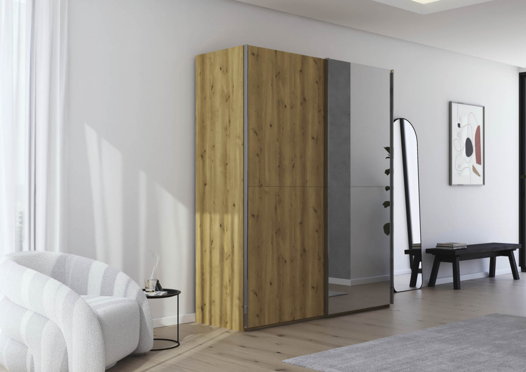 Gestalten Sie Ihren Schwebetürenschrank ganz nach Ihren Wünschen. Wählen Sie aus verschiedenen Front- und Korpus-Ausführungen, um Ihrem Raum eine persönliche Note zu verleihen. Auch die Griffleisten können Sie in unterschiedlichen Designs anpassen, um den perfekten Akzent zu setzen. Mit den wählbaren Breiten passt sich der Schrank ideal an Ihren Raum an und bietet dabei großzügigen Stauraum. Ein Möbelstück, das sich durch Individualität und zeitlose Eleganz auszeichnet.