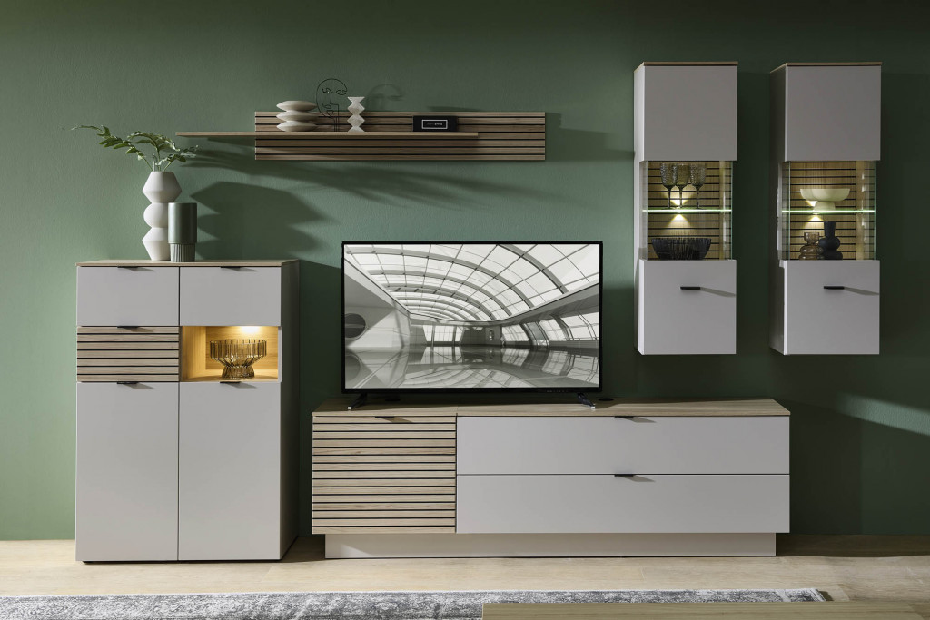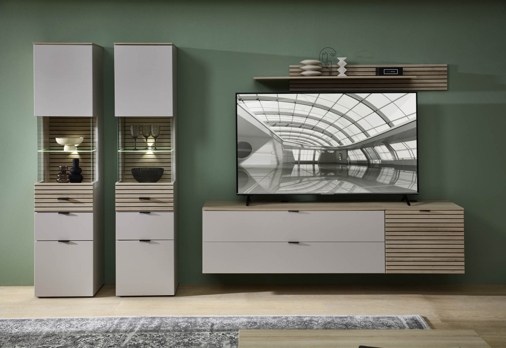 Kaschmir mit Absetzungen in Riva Eiche Nachbildung, oder Schilfgrün supermatt mit Absetzungen in Eiche Artisan Nachbildung, inkl. LED-Beleuchtung, mit Softclose und Selbsteinzug