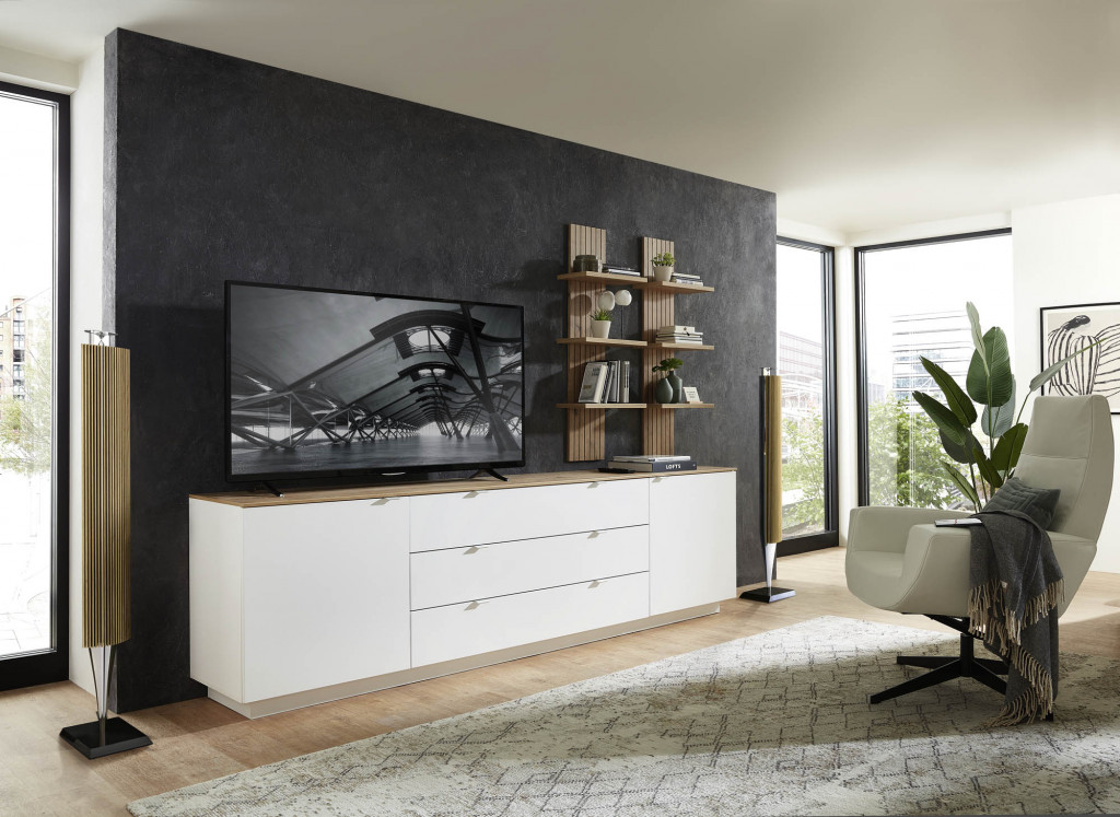Eiche Artisan Nachbildung und schilf supermatt, Metallgriffe silber matt, mit Softclose und Selbsteinzug, inkl. LED-Beleuchtung,bestehend aus Lowboard, mit 2 Türen und 3 Schüben, BHT ca. 240 x 77 x 44 cm und 2 Wandpaneelen mit je 3 Böden, BHT ca. 38 x 120 x 22 cm