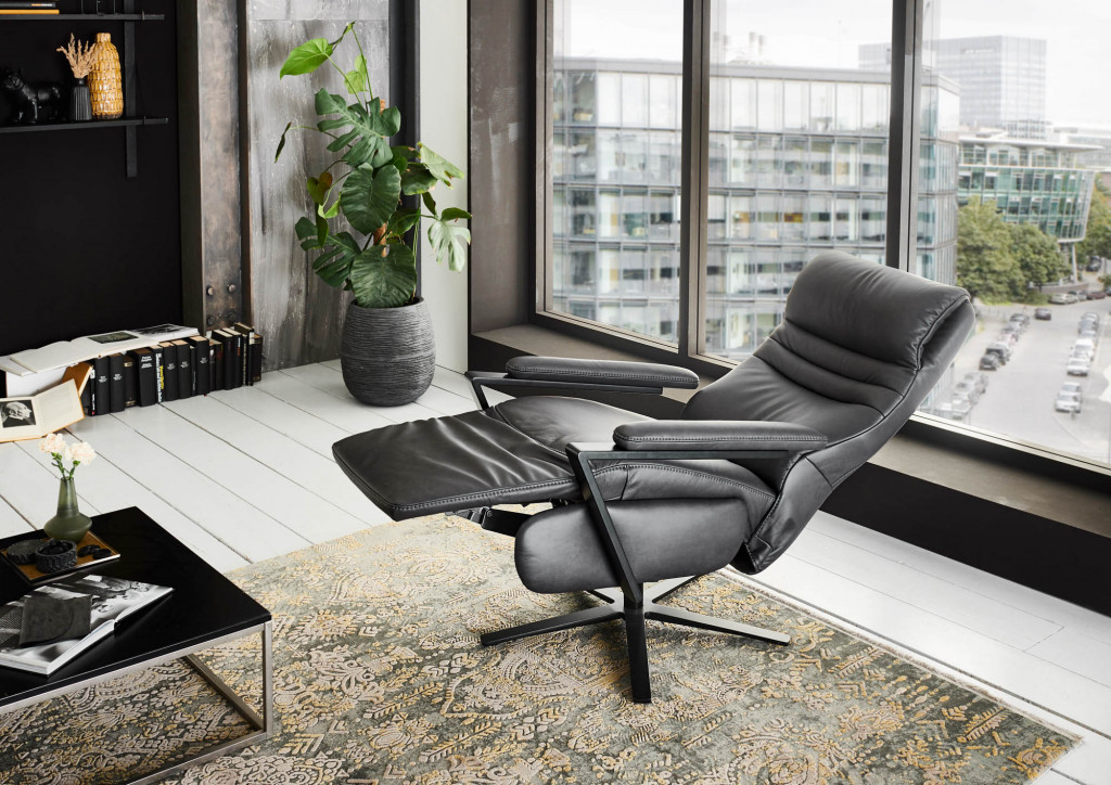 Leder LongLife Evita, Farbe honey, Metall-Armteil schwarz matt, verstellbare Armteilauflage 0217 (MP), Drehteller DT 6 Sternfuss schwarz matt, Sitzhöhe 49 cm, Sitztiefe 53 cm 1222 - Funktionssessel manuell mit Gasdruck, Ergonomie M2, BHT ca. 70/115/85 cm, Liegelänge ca. 171 cm