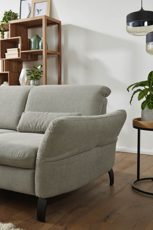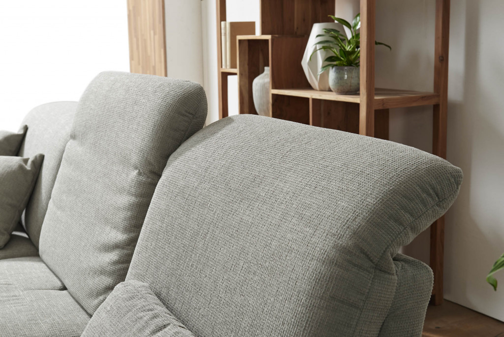 Stoff Chrono, Farbe silber, Rücken echt, Armteil klappbar inklusive, Sitzqualität soft, Metallfuß 4.28 schwarz matt, Sitzhöhe 44 cm, Sitztiefe 56-75 cm, bestehend aus: 70102 - Longchair groß, Armteil links klappbar, Kopfteilverstellung inklusive, BHT ca. 125/81/225 cm 02111 - Sofa 2-sitzig, Armteil rechts, 2x Sitztiefenverstellung inklusive, 2x Kopfteilverstellung inklusive, BHT ca. 185/81/115 cm