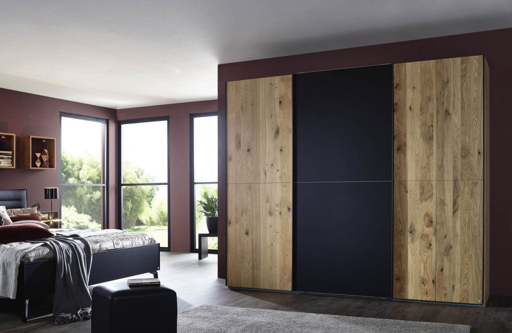 Schwebetürenschrank 5BGG - Korpus Alpinweiß, Front Glas seidengrau glänzend (PG2), Griffleisten chromfarben, 3-türig, BHT ca. 240/223/68 cm