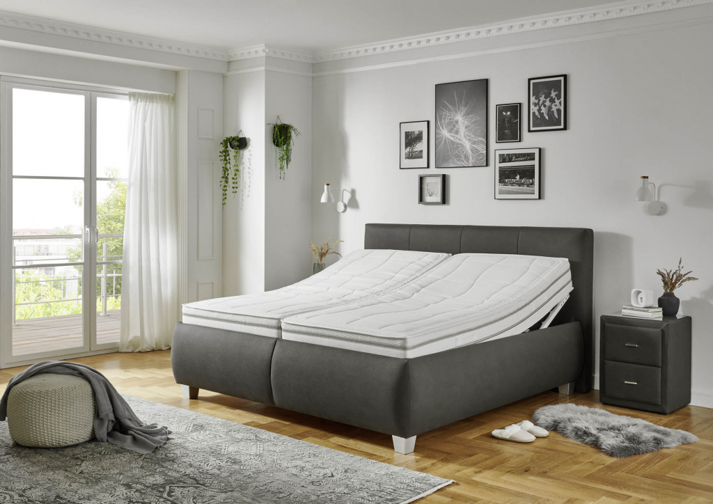 Bezug Mammut, Farbe anthrazit, Rücken unecht, bestehend aus: Unterbau Bettkasten, 2 x Lattenrahmen XL 2 x 7-Zonen-Taschenfederkern-Matratze,H3/H4, Bezug Drell geteilt Liegehöhe ca. 68 cm Füße Kunststoff, 10 cm Liegefläche 200 x 200 cm