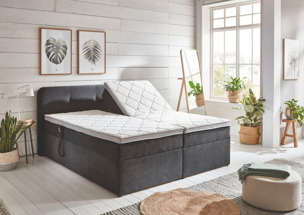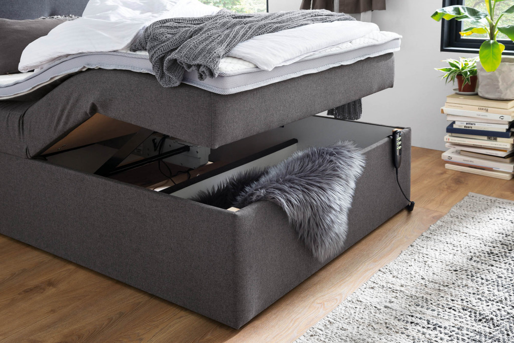 Bezug in anthrazit, 50444-710, unten Basisgestell mit motorischer Verstellung von Kopf- und Fussteil,Motor 6500 N, inkl. Notabsenkung und Fernbedienung, mit Stauraum, oben 7-Zonen-Taschenfederkern mit integriertem Viscoschaum-Topper 6 cm, Bezug bis 30 Grad waschbar, Liegefläche ca. 120x200 cm, Liegehöhe ca. 63 cm, BHT ca. 130x104x213 cm