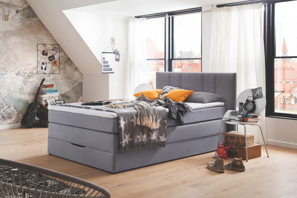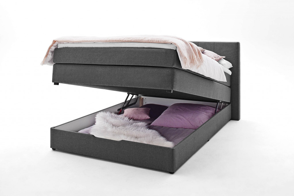 Bezug in grau 50340-720, Kopfteil ca. 10 cm tief und 105 cm hoch, mit Ziernähten in Kontrastfarbe, Rücken unecht, unten Basisgestell mit Bettkastenfunktion, zu öffnen per Gasdruckfeder, Bonell-Federkern, Höhe ca. 42 cm, Umrandung bezogen mit Möbelstoff , oben Bonell-Federkern, Gesamthöhe ca. 16 cm, inkl. Komfortschaum-Topper, Höhe ca. 5cm, abnehmbar und bis 60 Grad waschbar, Liegefläche ca. 140x200 cm, Liegehöhe ca. 63 cm, BHT ca. 160x105x210 cm