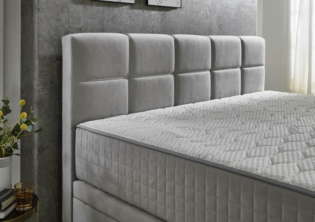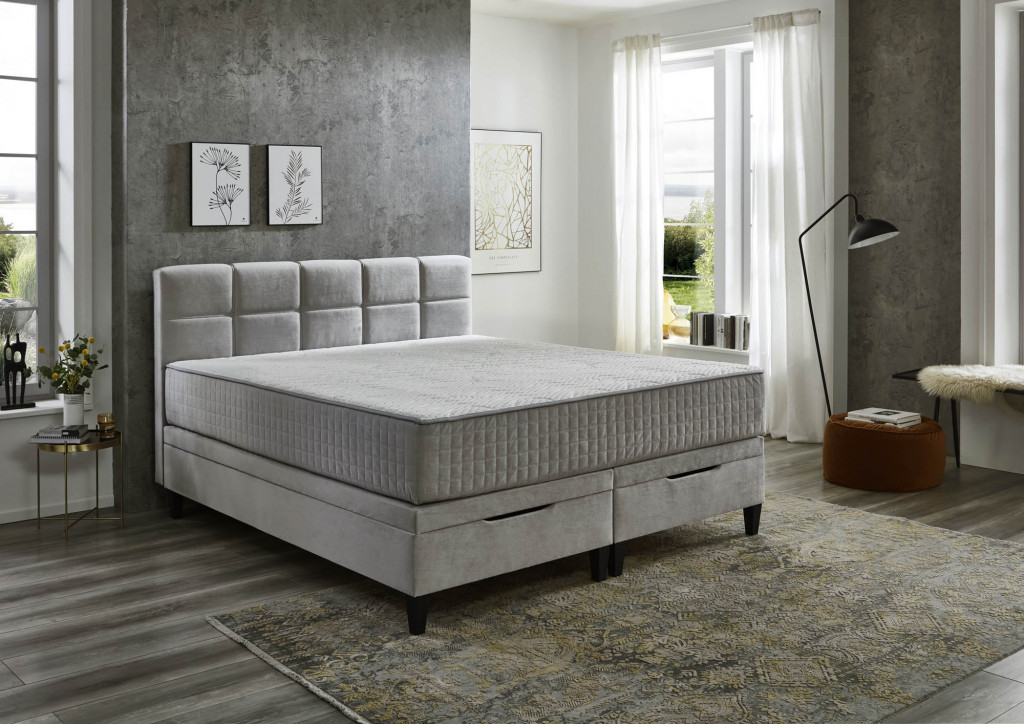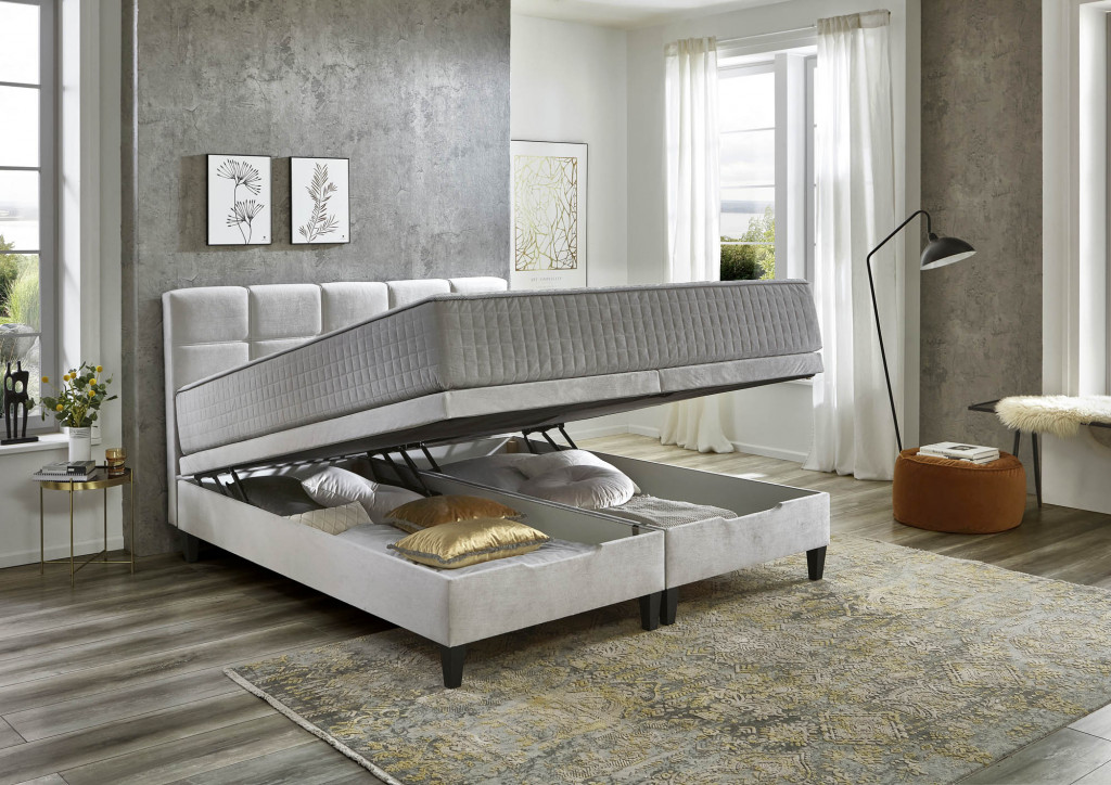 Bezug silber, 50562-720, unten 2 Basisboxen mit Bettkasten, Höhe ca. 42 cm, oben 7 Zonen Taschenfederkern-Matratze - wendbar H2/H3, Höhe: 18 cm, 1 Kopfteil mit Ziernähten, Höhe ca. 114 cm, Tiefe ca. 13 cm, Rücken unecht, Versteppung mit Komfortschaum, inkl. integriertem Topper, waschbar bis 40 Grad, Gesamthöhe der Matratze ca. 30 cm, Liegeseite aus verstepptem Komfortschau, Microfaser-Gewebe, Einfassung mit Kordel umlaufend, Reißverschluss, BHT ca. 180x114x213cm, Liegefläche: ca. 180x200 cm, Gesamthöhe ca. 72cm (inkl. Füße)