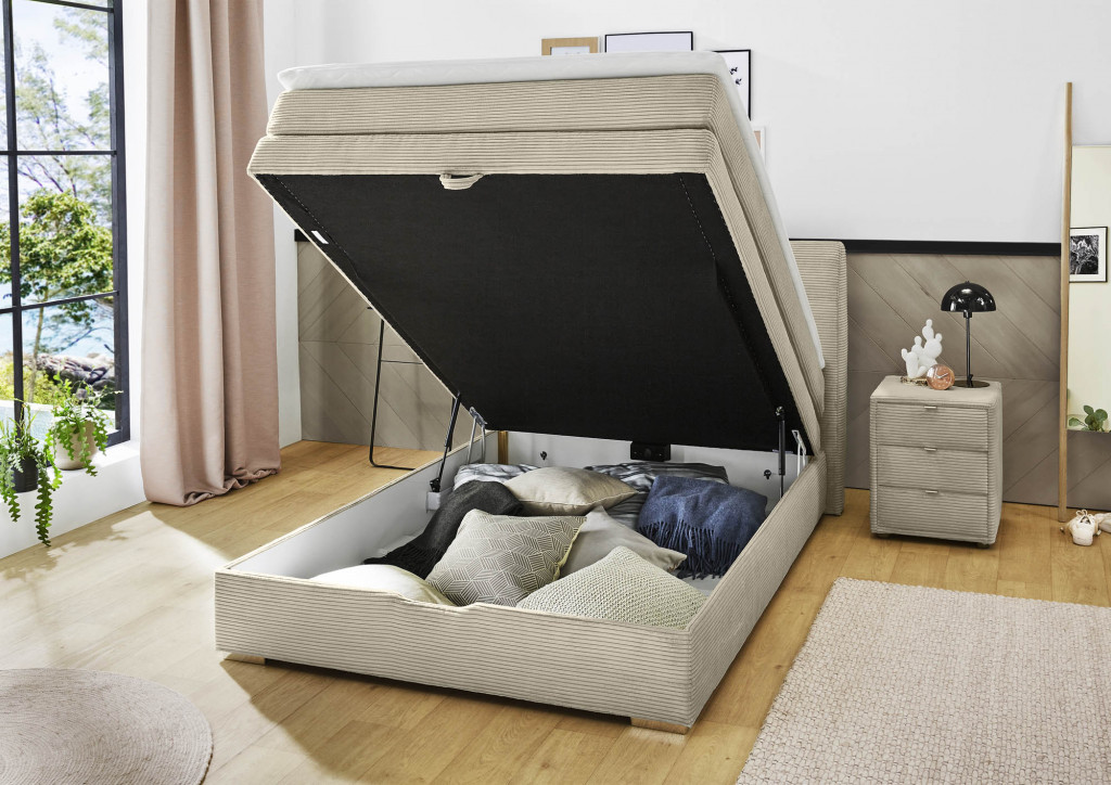Liegefläche ca. 140x200 cm, Bezug Cordstoff 426/17 greige, Füße chromfarbig, unten Bettkastenbox, belüftet und mit Gasdruckfedern zu öffnen, darüber ein Hub-Matratzenrahmen mit Bonellfederkern, oben Bonellfederkern, inkl. PU-Schaumtopper, Bezug bei 60 Grad waschbar, BHT ca. 154/105/217 cm, Liegehöhe ca. 64 cm