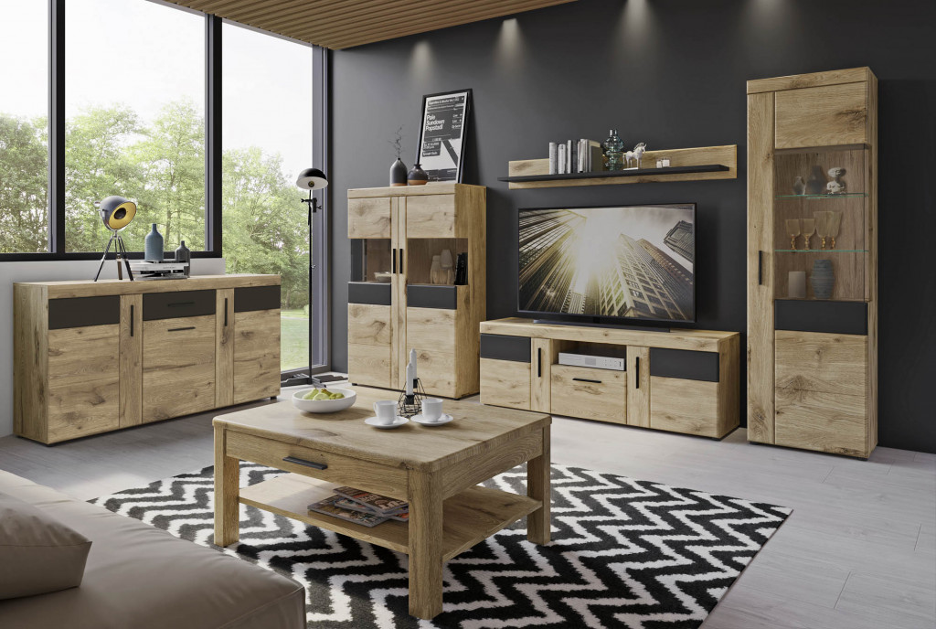 Eiche Viking Nachbildung/Kosmos Grau, Softclose, Kunststoffgriffe, Füße Kunststoff, Vitrine ca. 93 cm Breite, Sideboard ca. 185 cm Breit, Beleuchtung optional