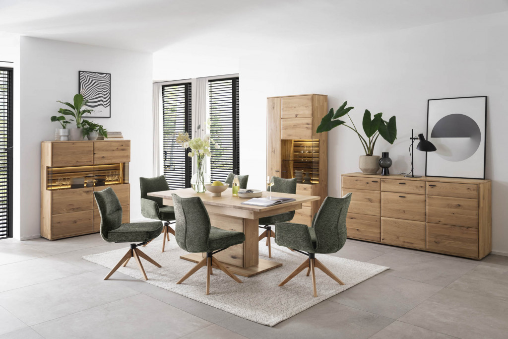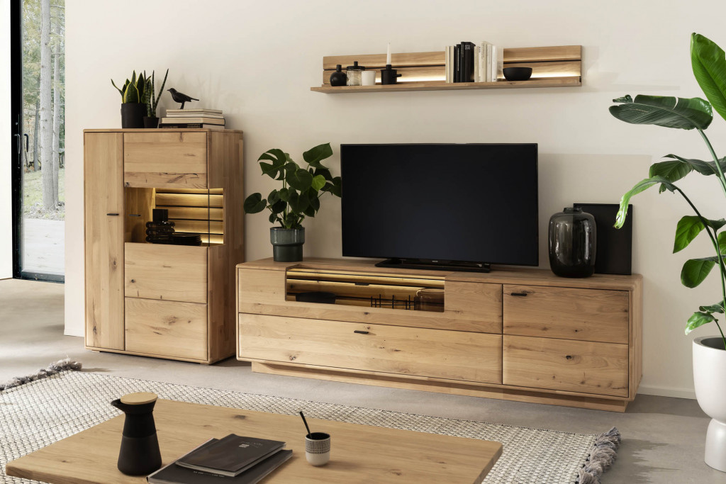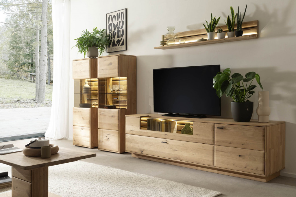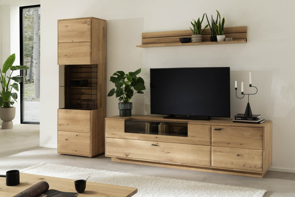 Front Ast/Balkeneiche massiv durchgehende Lamelle in Kristalleiche geölt, Korpus Ast/Balkeneiche massiv keilgezinkt in Kristalleiche geölt, Absetzung Schattenfuge, Parsolglas braun, Griffe Metall anthrazit, Schubkästen und Türen mit Dämpfung, Kombi bestehend aus: