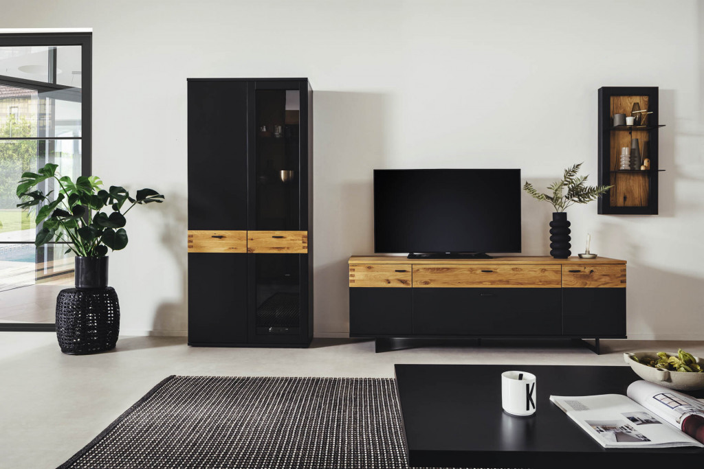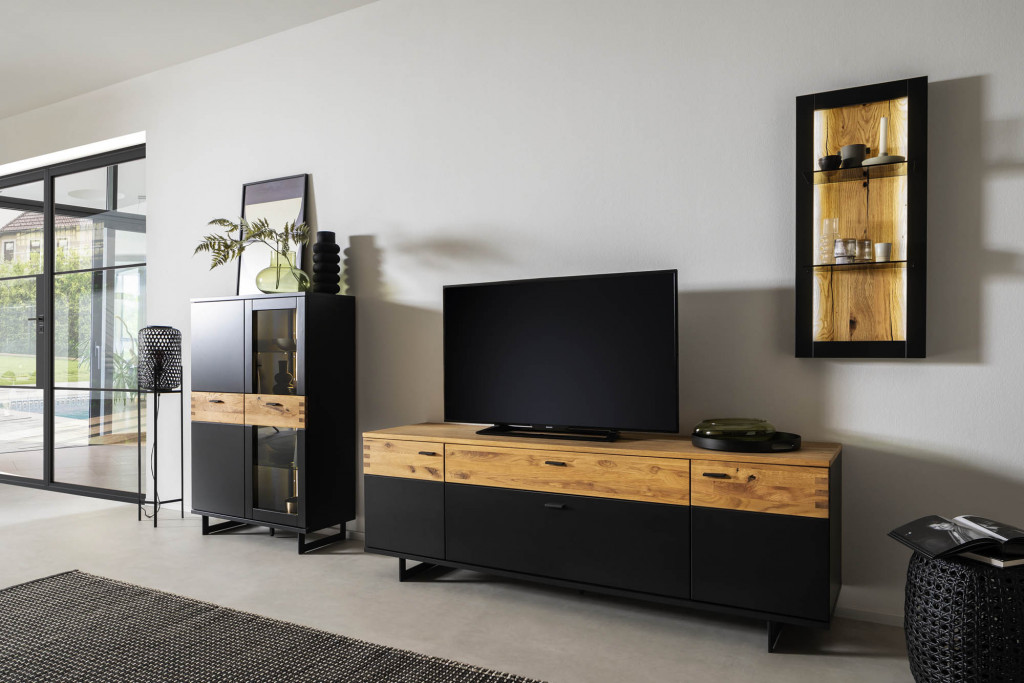 Front schwarzgrau lackiert, Absetzung Wildeiche massiv durchgehende Lamelle, Oberfläche geölt, Frontglas Parsol grau, Korpus schwarzgrau lackiert, Absetzung Wildeiche furniert, Oberfläche geölt, sichtbare Rückwande Risseiche furniert, Oberfläche geölt, Wandregalböden Parsol grau, Griffe Metall schwarzgrau, Metallkufen schwarzgrau, Türen und Schubkästen gedämpft, bestehend aus:
