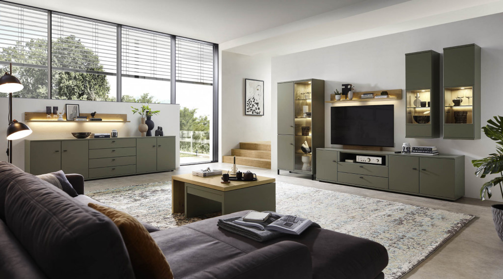 Korpus/Front Lack Seidengrau, Rückwand Eiche Graphit, Füße Sockelgleitern,