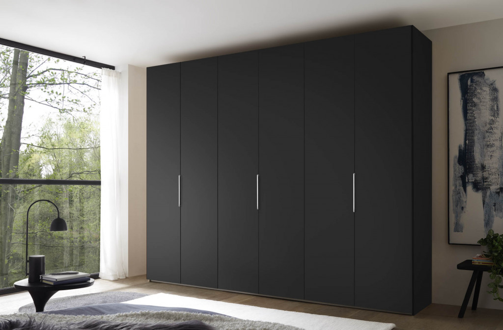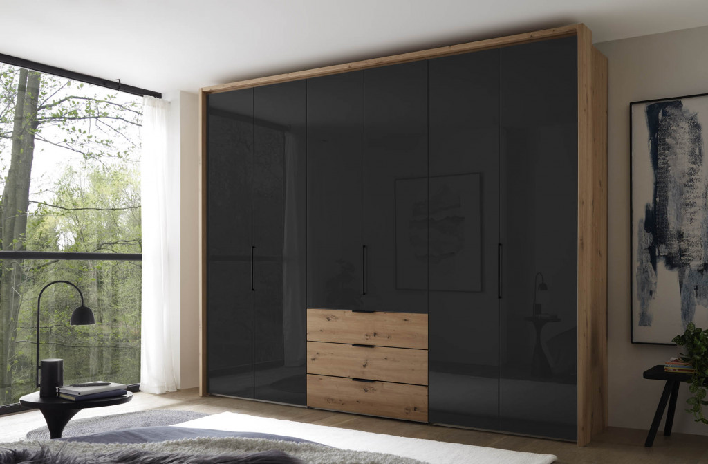 Der elegante Drehtürenschrank überzeugt durch seine hochwertige Verarbeitung und zeitloses Design. Der Korpus im Dekor Sand harmoniert perfekt mit den Fronten aus edlem Sandglas. Die mittig platzierten schwarzen Zierleisten und Griffe setzen stilvolle Akzente und unterstreichen die moderne Optik. Mit sechs Türen bietet der Schrank großzügigen Stauraum und eine durchdachte Innenaufteilung. Maße: B/H/T ca. 298/222/63 cm. Weitere Größen und Ausführungen sind erhältlich, sodass sich der Schrank individuell an Ihre Wohnsituation anpassen lässt. Ein Möbelstück, das Ästhetik und Funktionalität auf höchstem Niveau vereint.