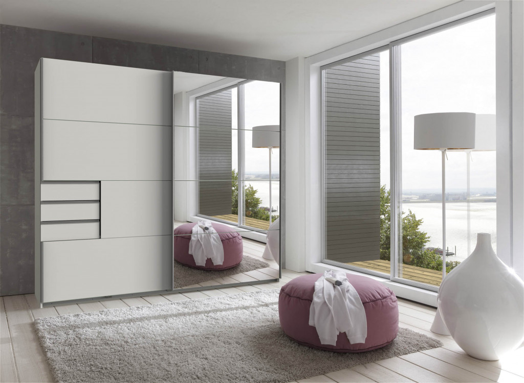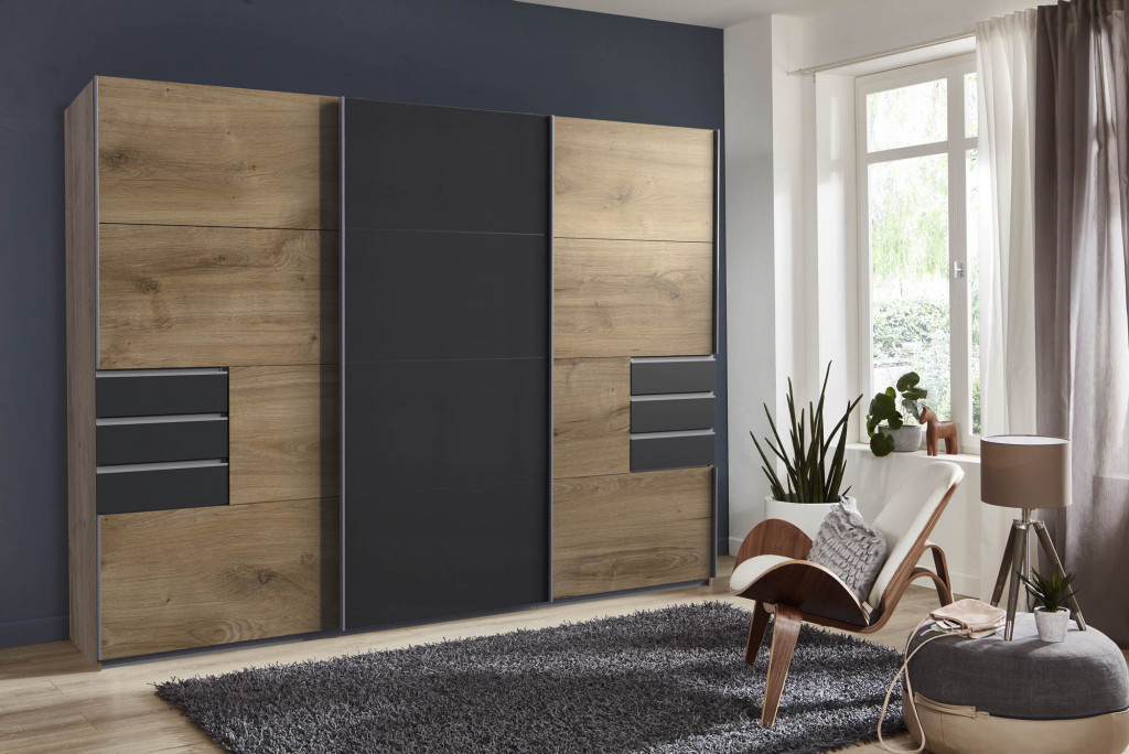 Schwebetürenschrank in -E60 Graphit, durchgängige Türfront Glas Schwarz, Schubkasten Graphit, BHT ca. 225/210/64cm