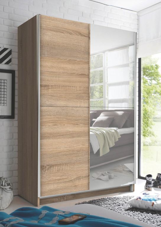 Schwebetürenschrank 2-trg. mit Spiegel in -17 Weiß , BHT 125x195,5x38cm, Inneneinteilung: 1 Mittelseite/links 5 Böden, rechts 1 Boden/1 Garderobenauszug