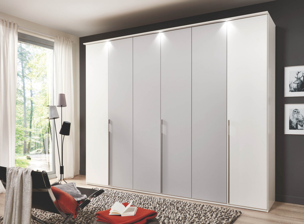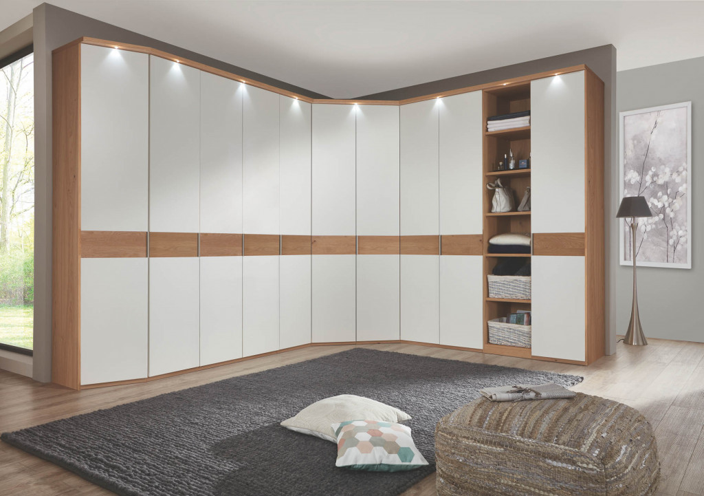 Front mit Bauchbinde, Front Lack weiß, Bauchbinde Wildeiche Riffelholz, Korpus Wildeiche (PG2), Griff N1 nickelfarbig, bestehend aus: 913008 - Schwebetürenschrank, 2-türig, Aufteilung 90/60/60/90 cm, inklusive Schließdämpfer, BHT ca. 301/230,2/68 cm 903009 - Kranzleiste, 19mm, 300 cm Breit 96003 - Wechsel zu echtholzfurnierten Griffleisten