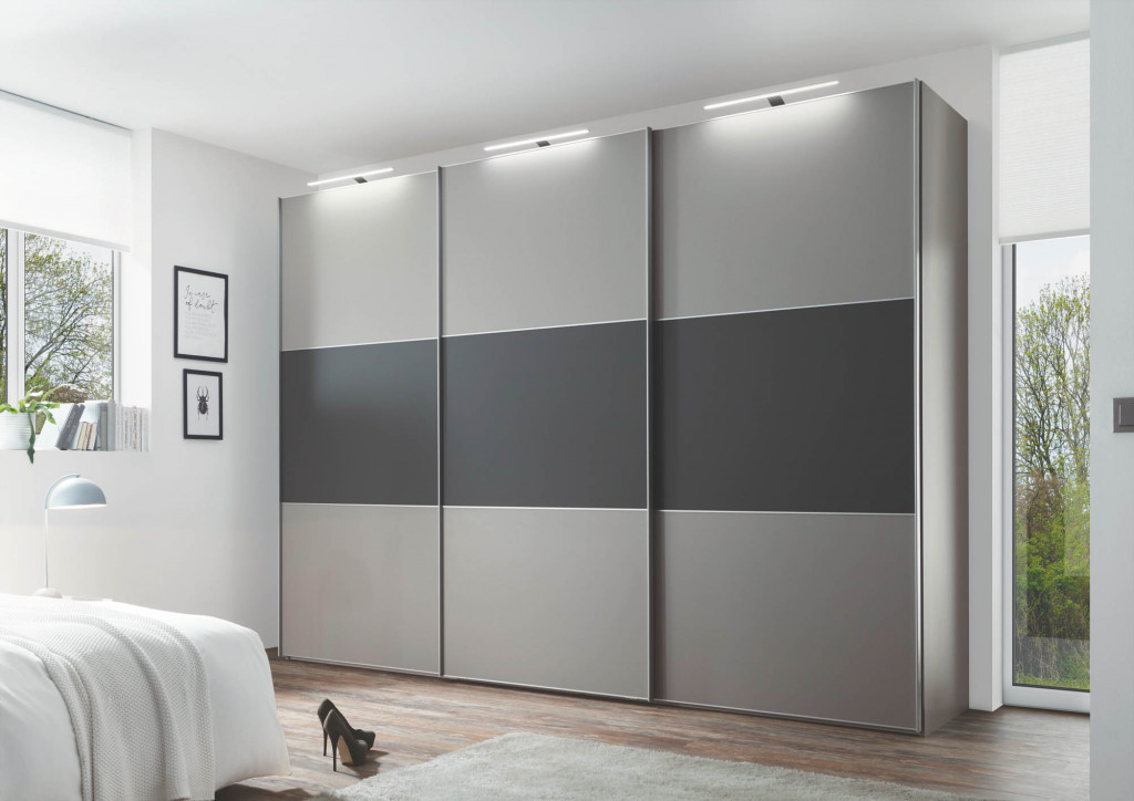 Korpus Dekor weiß, Front Hochglanz weiß, Spiegel mittig, Frontausführung 3, Griff- und Zierleisten schwarz, mittig Ausstattung Premium - Türen gedämpft, T-Einteilung, 2er Schubkasten gedämpft - Schwebetürenschrank, 3-türig, BHT ca. 280/222/63 cm
